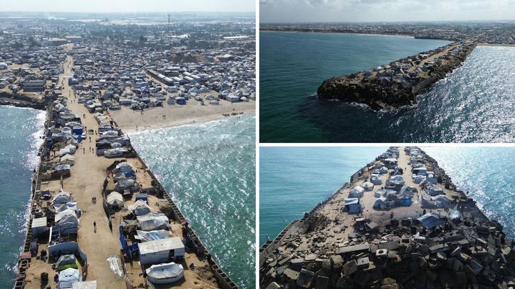 Snimak iz drona prikazuje šatore postavljene u luci Karare između Deir al-Balaha i Khan Yunisa u južnoj Gazi. Luka, uglavnom uništena tijekom dvogodišnjih izraelskih napada na Gazu, postala je privremeno sklonište za raseljene Palestince čiji su domovi uništeni. Unatoč čestoj pucnjavi s izraelskih ratnih brodova, tisuće obitelji i dalje žive u improviziranim šatorima uz obalu. Nezamisliva tuga prvi red do mora.