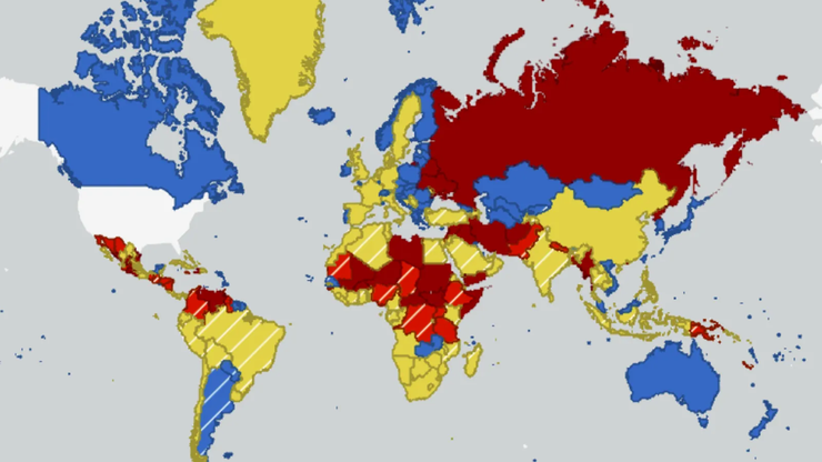 Razina 3: Razmislite o ponovnoj procjeni putovanja. Putovanja u zemlje treće razine se ne preporučuju zbog ozbiljnih rizika za sigurnost i dobrobit putnika. Američka vlada može imati ograničene mogućnosti pružanja pomoći svojim građanima u tim državama. (Svjetlo crvena boja na karti)