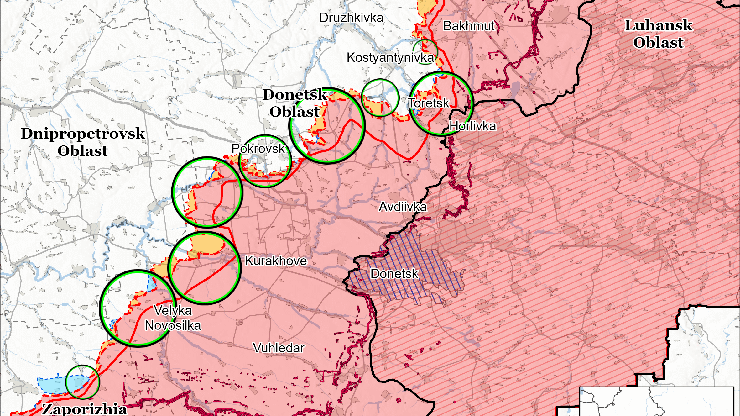 Geolocirana snimka objavljena 11. lipnja pokazuje da su ruske snage nedavno napredovale zapadno od Malinivke (istočno od Pokrovska). Ruske snage nastavile su kopnene napade sjeveroistočno od Pokrovska u blizini Mirne; istočno od Pokrovska u blizini Elizavetivke, Miroljubivka i Novotoretckog; jugoistočno od Pokrovska u blizini Lisivke; južno od Pokrovska u blizini Novoukrajinke; i jugozapadno od Pokrovska u blizini Zvirova, Kotlina i Udačne 1. lipnja