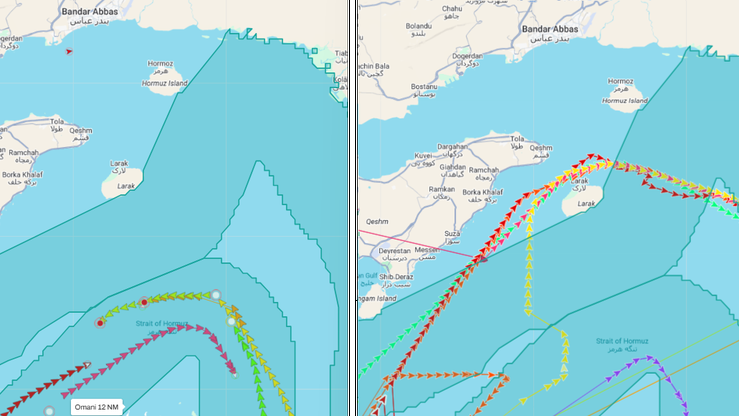 AIS transponderi za dva teretna broda bili su onesposobljeni pri prilazu tjesnacu, tako da ih nije moguće pratiti kako plove oko otoka Larak; međutim, njihov signal se ponovno pojavljuje u blizini iranske obale, što ukazuje na to da su i oni napravili zaobilazni put. Značajno je da jedan od brodova za rasuti teret koji je nedavno izašao iz zaljeva uobičajenim, kraćim putem kroz omanske teritorijalne vode nije došao iz Irana.