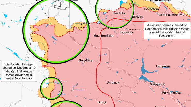 Ruske snage nastavljaju ostvarivati taktičke uspjehe južno od Pokrovska. Snimke objavljene 10. prosinca pokazuju da su napredovale u zapadnom Noviju Trudu i duž autoceste E50 južno od Dačenskeja, navodi ISW.