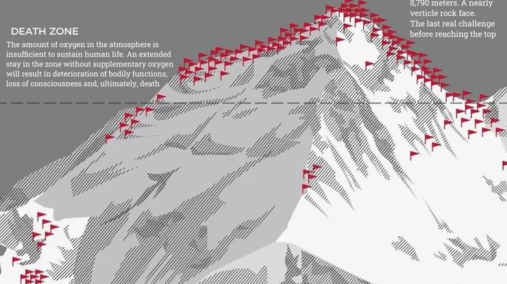 U višim dijelovima Mount Everesta, planinari s vremenom stignu do tzv. smrtne zone, prostor ekstremne nadmorske visine iznad kojih je tlak kisika nedostatan za održavanje ljudskog života tijekom duljeg razdoblja. Ova visina općenito se smatra 8.000 metara, gdje je atmosferski tlak manji od 356 milibara. Pojam je 1953. godine uveo švicarski liječnik Edouard Wyss-Dunant. Dugotrajni boravak iznad 8.000 metara bez dodatnog kisika dovodi do postupnog slabljenja tjelesnih funkcija i, na kraju, smrti.