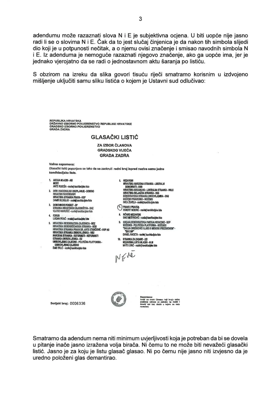 U tom smislu pored toga što je na listiću jasno zaokružen broj 7. Ispred kandidacijske liste on sadrži i nečitak tekst na dnu cijelog listića, dakle ispod svih kandidacijskih lista (tj. ispod 10. liste) koji, prema ocjeni ZIP-a, znači “neće”, “ne može” ili nešto slično. Iz njega je nemoguće zaključiti da je to uopće riječ, a ne škrabotina. Gatati da se u tom adendumu može razaznati slova N i E je subjektivna ocjena. U biti uopće nije jasno radi li se o slovima N i E. Čak da to jest slučaj činjenica je da nakon tih simbola slijedi dio koji je u potpunosti nečitak, a o njemu ovisi značenje i smisao navodnih simbola N i E. Iz adenduma je nemoguće razaznati njegovo značenje, ako ga uopće ima, jer je jednako vjerojatno da se radi o jednostavnom aktu šaranja po listiću.
