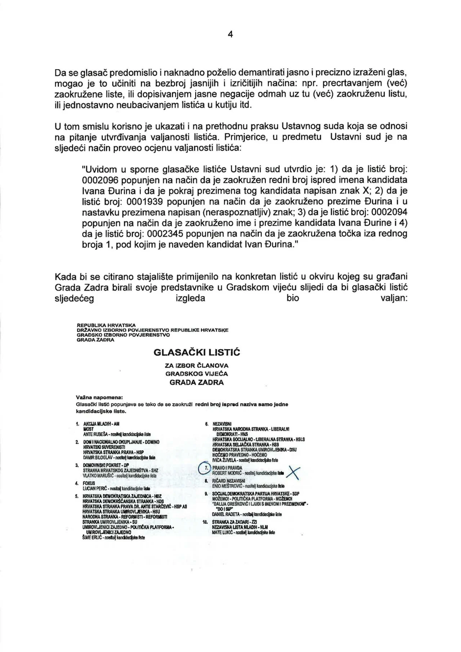 Kada bi se citirano stajalište primijenilo na konkretan listić u okviru kojeg su građani Grada Zadra birali svoje predstavnike u Gradskom vijeću slijedi da bi glasački listić sljedećeg izgleda bio valjan: