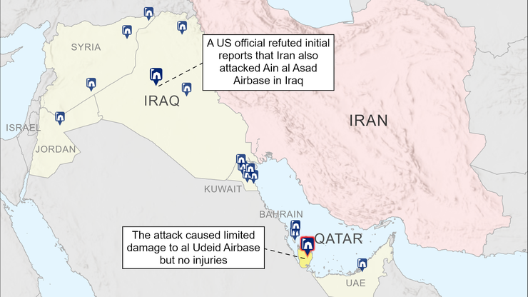 Iran je jučer izveo uzvratni, ali uglavnom simboličan, napad balističkim raketama usmjeren na američku zračnu bazu u Kataru i s obzirom na razvoj situacije, to bi mogao biti njihov oproštajni napad. Iran je lansirao 14 balističkih raketa srednjeg i kratkog dometa na najveću američku poziciju na Bliskom istoku - zračnu bazu al-Udeid - neposredno prije 13:00 sati po istočnom vremenu. Sjedinjene Države i partnerske snage presrele su 13 raketa. Trump je potvrdio da iranski napad nije ozlijedio niti ubio nijednog američkog pripadnika vojske ili Katara te da je prouzročio "gotovo nikakvu štetu". Tajnik iranskog Vrhovnog vijeća nacionalne sigurnosti Ali Akbar Ahmadian tvrdio je nakon napada da je Iran ispalio jednu raketu na zračnu bazu al-Udeid za svaku bombu koju su Sjedinjene Države bacile na iranska nuklearna postrojenja 21. lipnja. U početnim izvješćima tvrdilo se da je Iran također ispalio jednu balističku raketu kratkog dometa usmjerenu na američke snage na zračnu bazu Ain al-Asad u Iraku, ali američki vojni dužnosnik opovrgnuo je tu tvrdnju.
