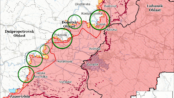 Institucija ISW procjenjuje da ruski prodori sjeveroistočno od Pokrovska podržavaju obuhvat Pokrovska i Mirnograda (smještenog neposredno istočno od Pokrovska) presijecanjem autoceste T-0515 Pokrovsk-Dobropillja te otežavaju ukrajinske izlazne pravce iz grada. Ruske snage uglavnom su imale poteškoće u napredovanju prema jugoistoku, jugu i jugozapadu od Pokrovska zbog ukrajinskih dron operacija od kraja 2024. godine. Ruske snage su krajem kolovoza 2024. kratko zauzele predgrađa Mirnograda, ali su ih ukrajinske snage kasnije istjerale iz grada. Očekuje se da će ruske snage nastaviti pokušaje napredovanja sjeveroistočno od Pokrovska dok će istovremeno pojačavati napade na grad s juga i jugozapada u nastojanju da prisile ukrajinske snage na povlačenje zbog prijetnje obuhvata.