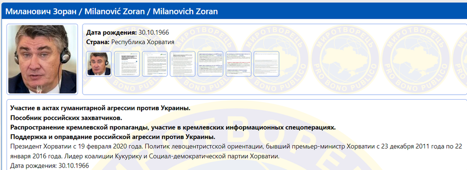 Svojedobno se na njoj zbog izjava o Rusiji i Ukrajini našao i hrvatski predsjednik Zoran Milanović. Hrvatski predsjednik završio je na notornoj stranici neposredno prije invazije na Ukrajinu. Milanovića su optužili za humanitarnu agresiju na Ukrajinu, pomaganje ruske agresije, distribuciju ruske propagande i podržavanje i opravdavanje ruske agresije na Ukrajinu. Bila je to reakcija na Milanovićeve riječi da se Hrvatska ni na koji način neće upletati u krizu dođe li do njezine eskalacije i da ondje neće imati svoje vojnike. Istaknuo je i da Ukrajini nije mjesto u NATO-u.